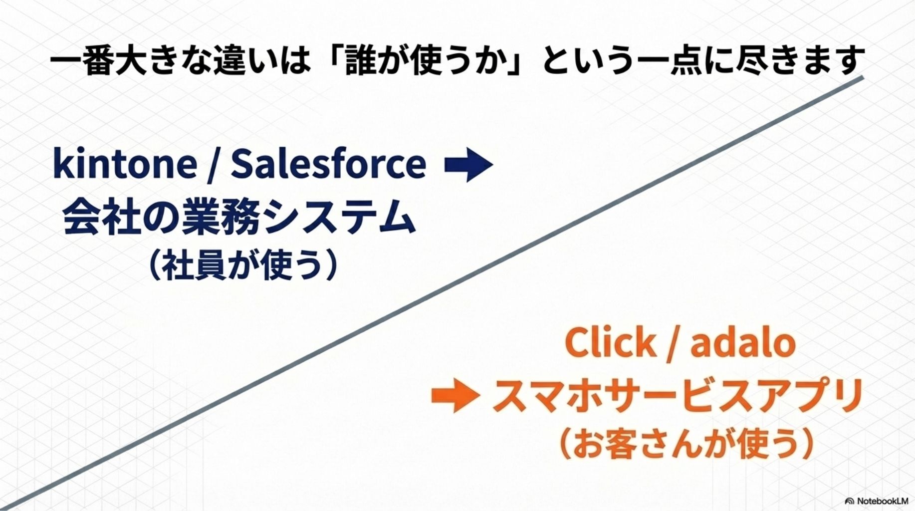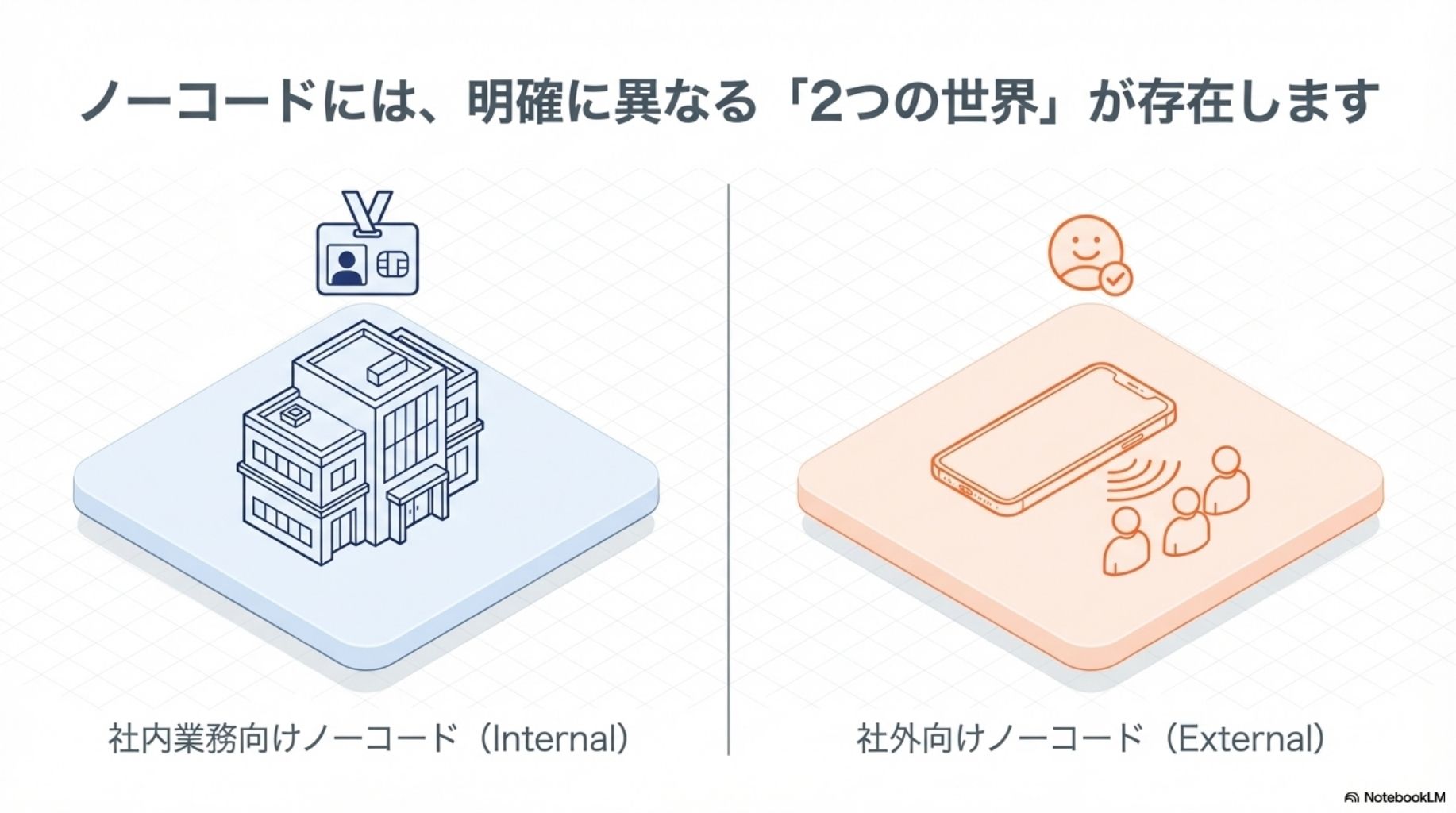 プログラミングの知識がなくてもアプリが作れる便利なツールですが、実はノーコードには大きく分けて2つの種類があります。それが社内業務向けノーコードと社外向けノーコードです。この違いを知らずにツールを選んでしまうと、「思っていたアプリが作れない」ということが起きてしまうかもしれません。
