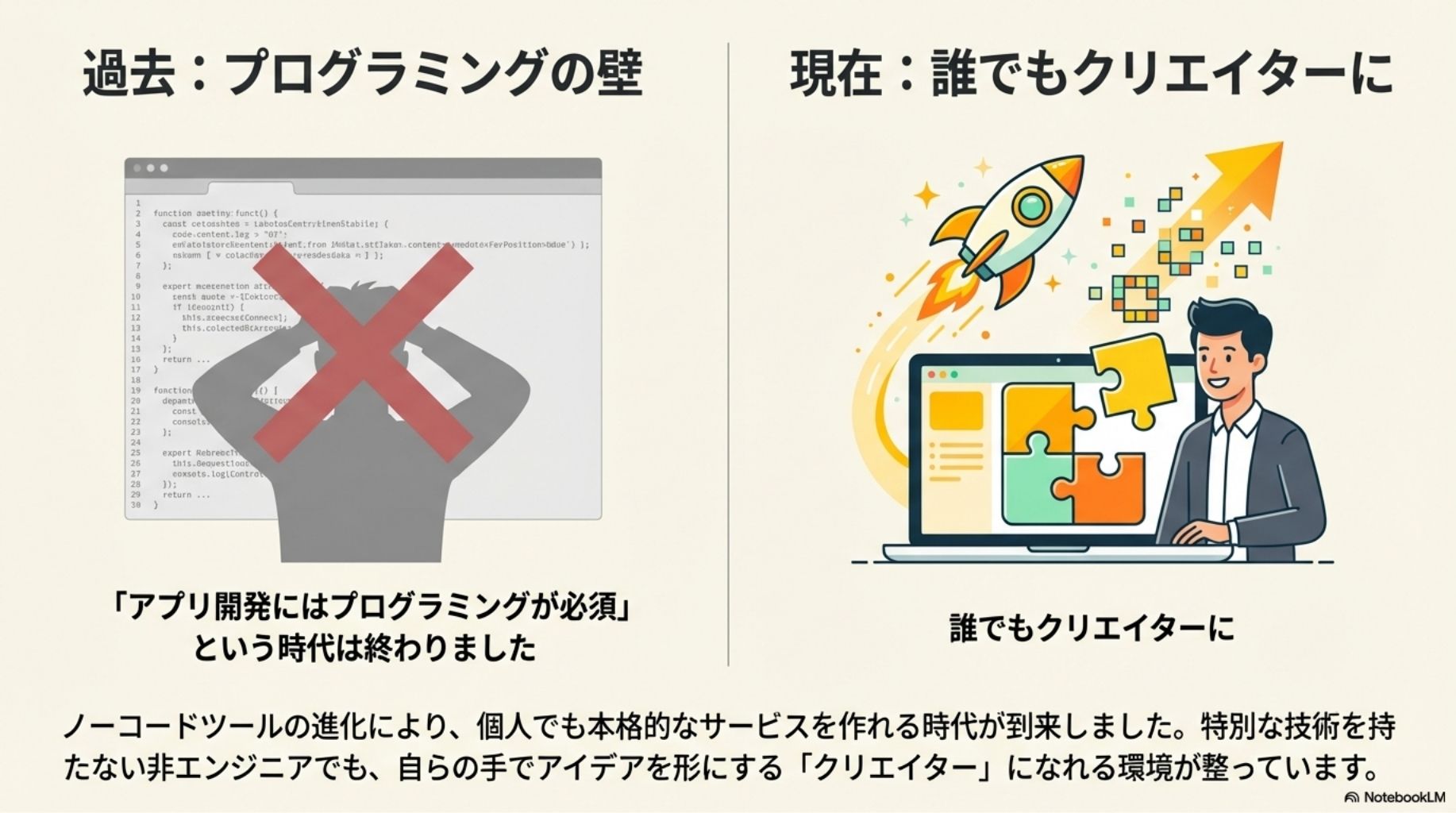 以前はアプリを作るには、プログラミングが必須でした。しかし現在はノーコードの登場によって、個人でもサービスを作れる時代になりました。実際に、
